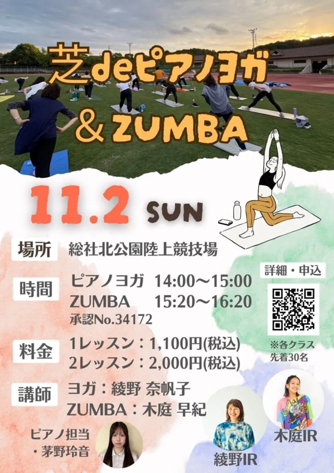 この度、11月2日(日)に北公園陸上競技場で『芝deピアノヨガ&ZUMBA』を開催いたします!