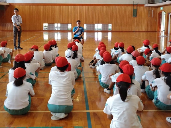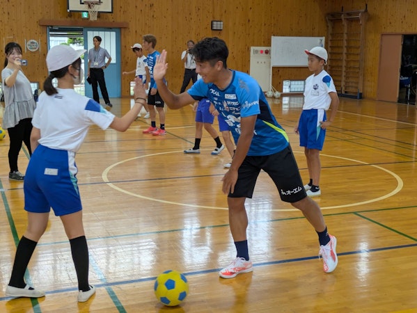 訪問先では、パス交換などのサッカー技術体験や、じゃんけんなどの遊びを通じて、選手と児童が楽しくふれあいました。キャリア教育の一環として実施された学校では「夢に向かってどのように努力したか」「挫折をどう乗り越えたか」など、児童の皆さんから選手へたくさん質問が飛んでいました。