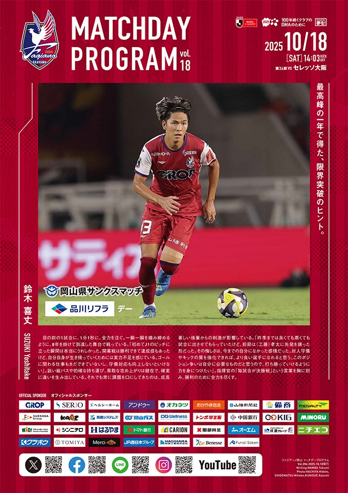 本日JFE晴れの国スタジアムで開催するセレッソ大阪戦のマッチデープログラムを電子版でお届けいたします。ぜひご覧ください。 10月18日セレッソ大阪戦 マッチデープログラムはこちら ※約5.3MB