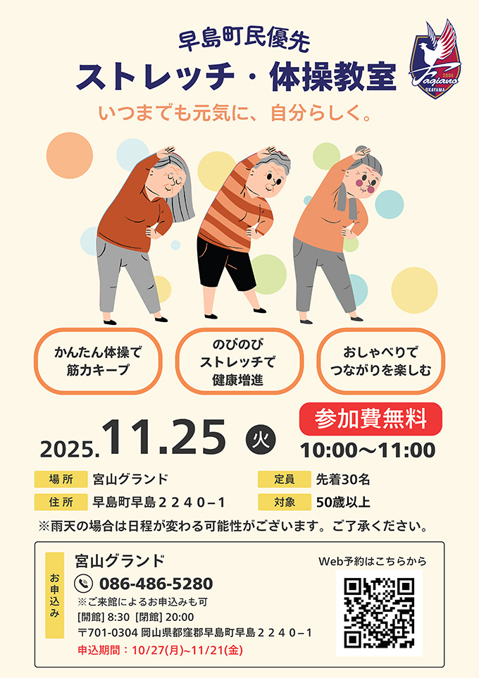 日にち:11月25日(火)場所:宮山グランド(岡山県都窪郡早島町早島2240-1)時間:10:00~11:00(60分)対象:50歳以上参加費:無料持ち物:動きやすい服装・水分■お申込みはコチラ電話:086-486-5280(宮山グランド管理事務所)WEB予約はこちら