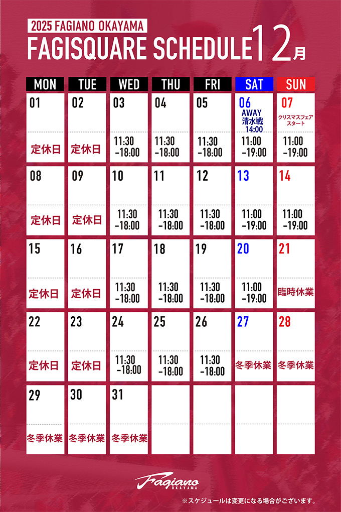 12月のファジスクエア営業時間をお知らせいたします。 12月7日よりクリスマスフェアを開催!皆さまのご来店を心よりお待ちいたしております。くわしくはこちら※2025年11月28日時点のスケジュールです。変更となる可能性がございます。