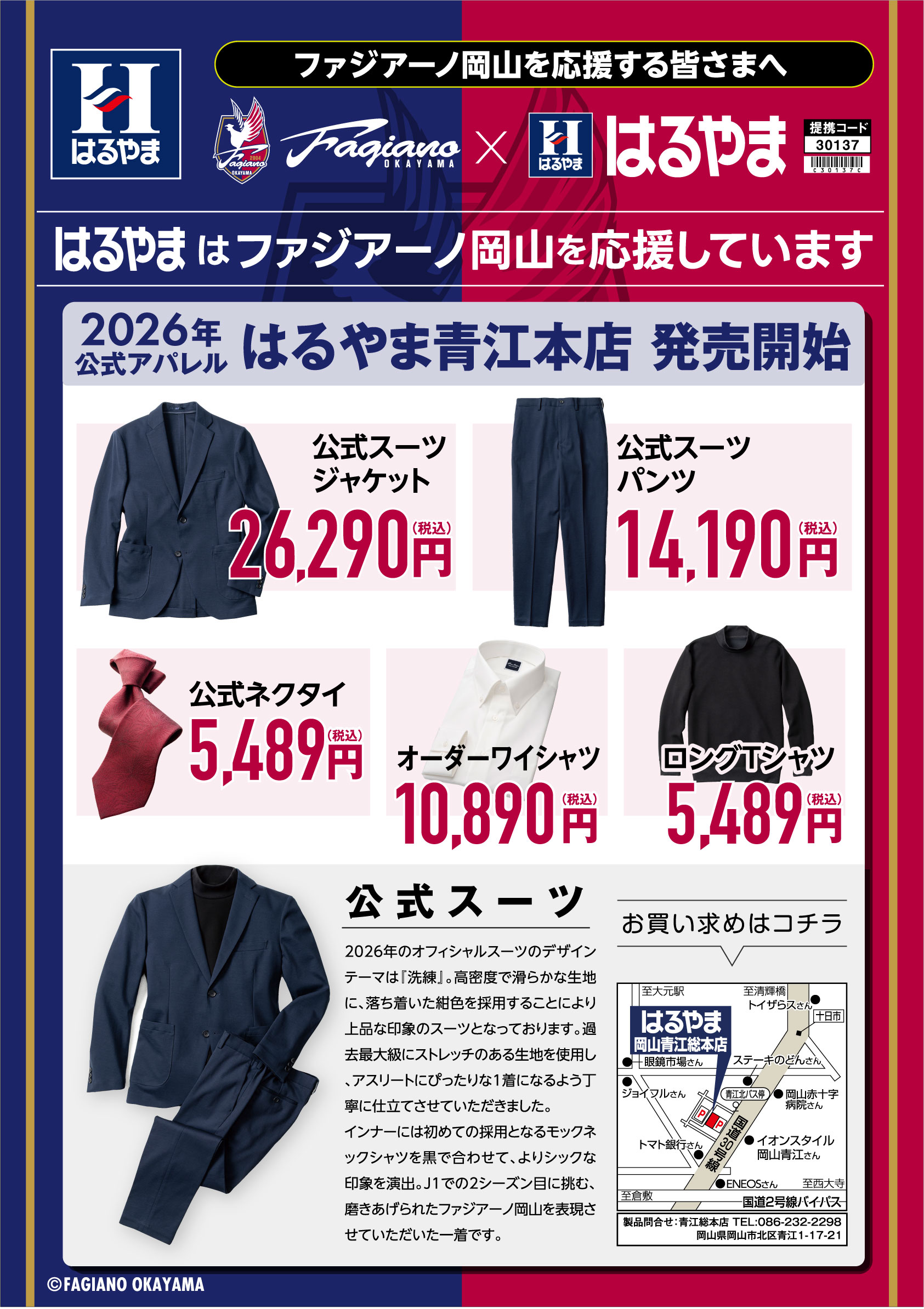 ファジアーノ岡山では2007年より引き続き、今シーズンもはるやまホールディングス様にオフィシャルスーツをご提供いただいております。