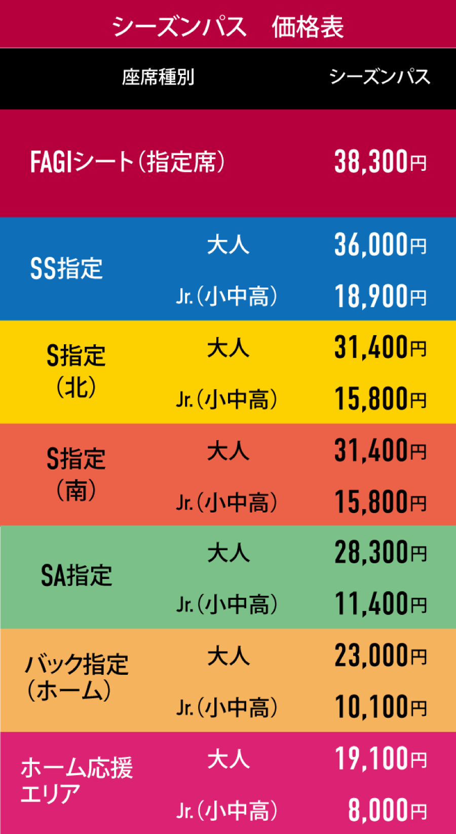 - ※メインスタンド側の指定席化に伴う、SA指定席に拡張されたシーズンパスの販売エリアの詳細については、販売開始前までにご案内を予定しておりますので、暫しお待ちください。
