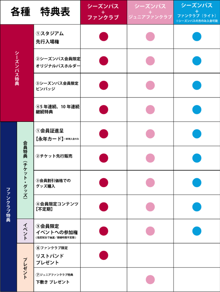 - ・シーズンパス、および付帯する権利について、名義変更や第三者への転売・貸与・譲渡などはできません。ただしクラブ公式リセール・譲渡サービスは除きます。